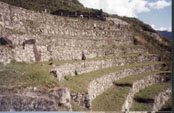 Zona agrícola . Los andenes, terrazas de cultivo,de Machu Picchu lucen como grandes escalones construidos sobre la ladera. Son estructuras formadas por un muro de piedra y un relleno de diferentes capas de material (piedras grandes, piedras menores, cascajo, arcilla y tierra de cultivo) que facilitan el drenaje, evitando que el agua se empoce en ellos (téngase en cuenta la gran pluviosidad de la zona) y se desmorone su estructura.